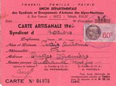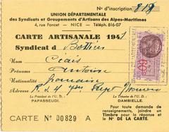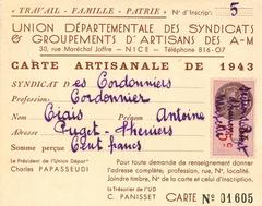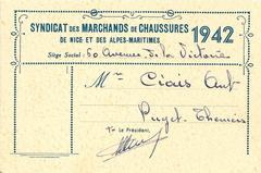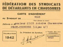 Carte d'adhésion au Syndicat des marchands de chaussures, de Nice et Alpes-Maritimes appartenant à Ciais Antoine, 1942.