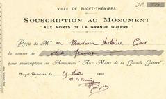 Ville de Puget-Théniers. Souscription au Monument " Aux Morts de la Grande Guerre"