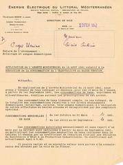 Energie électrique du littoral méditerranéen. Application de l'arrêté ministériel du 12 août 1942 relatif à la réduction de la consommation de l'électricité en basse tension.