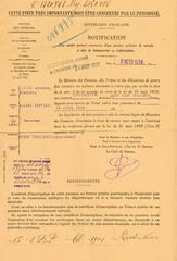 Notification d'un arrêté portant concession d'une pension militaire de retraite à titre de blessures ou infirmités, [délivrée à Antoine Ciais le 2 octobre 1936.]