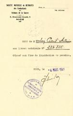 Lettre de la Société Mutuelle de Retraites des Combattants et Victimes de la guerre - 8, descente Crotti, Nice. Adressée le 4 mars 1941 à Antoine Ciais.