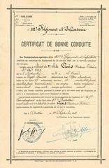 Certificat de bonne conduite adressé à Antoine Ciais, soldat de 2e classe matricule 3889 au 112e Régiment d'Infanterie.