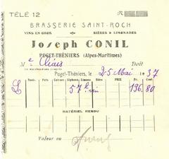 Facture de la Brasserie Saint Roch. Vins en gros - Bières & limonades. Joseph Conil, Puget-Théniers