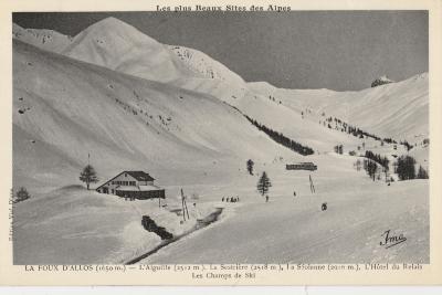 Les plus beaux sites des Alpes. - La Foux d'Allos (1650 m.) - L'Aiguille (2512 m.) - La Sestrère (2518 m.), La Siolanne [sic] (2910 m.), L'Hôtel du Relais, Les Champs de ski