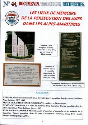 Documents, Témoignages , Recherches. n° 44 [Les lieux de mémoire de la persécution des juifs dans les Alpes-Maritimes]