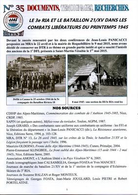 Documents, Témoignages , Recherches. n° 35 [ Le 3e R.I.A. et le bataillon 21/15 dans les combats libérateurs du printemps 1945]