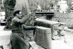 Jean Ros fabriquant un bât : découpe d'un arceau dans une planche de hêtre.