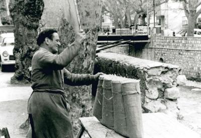 Jean Ros fabriquant un bât : La paille remplissant les coussinets est tassée au moyen d'une planche.