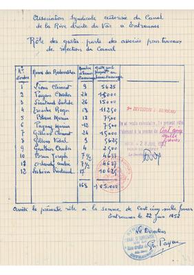 Entraunes - Rôle des quotes-parts des associés pour travaux de réfection du canal (2) - 1952