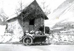 [Le side-car de la famille Gilloux devant l'ancienne Chapelle de la Sainte-Trinité - 1936]