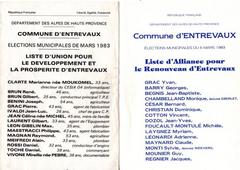 Commune d'Entrevaux - Elections Municipales de Mars 1983 - Liste d'Alliance pour le Renouveau d'Entrevaux