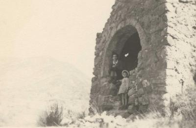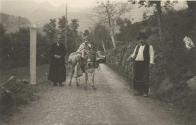 La Croix-sur-Roudoule, devant la chapelle Saint Arnoux. Âne de Zéphirin Bellieud, Marguerite Graglia et Philippe Graglia.