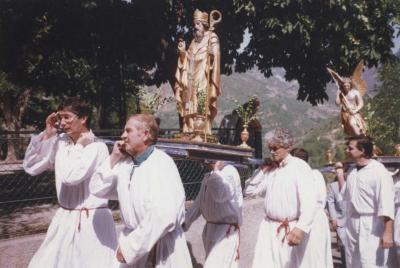 La Croix-sur-Roudoule, Procession à la chapelle Saint Arnoux avec Alain Ranuzzi, Jean Facchini, J.C Molinello et Roger Neri portant Saint Arnoux