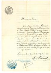Procuration donnée par Faraut Antoine à Desgeorges Toussaint pour le représenter sur les chantiers, signer tous attachements, ordres de service et toutes pièces relatives aux travaux d'extension des baraquements de Cabanes Vieilles, 1er juillet 1911.