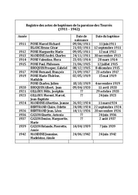[Liste alphabétique nominative des actes de baptême dans la paroisse des Tourrès ( 1911-1942) ] [Extraits]