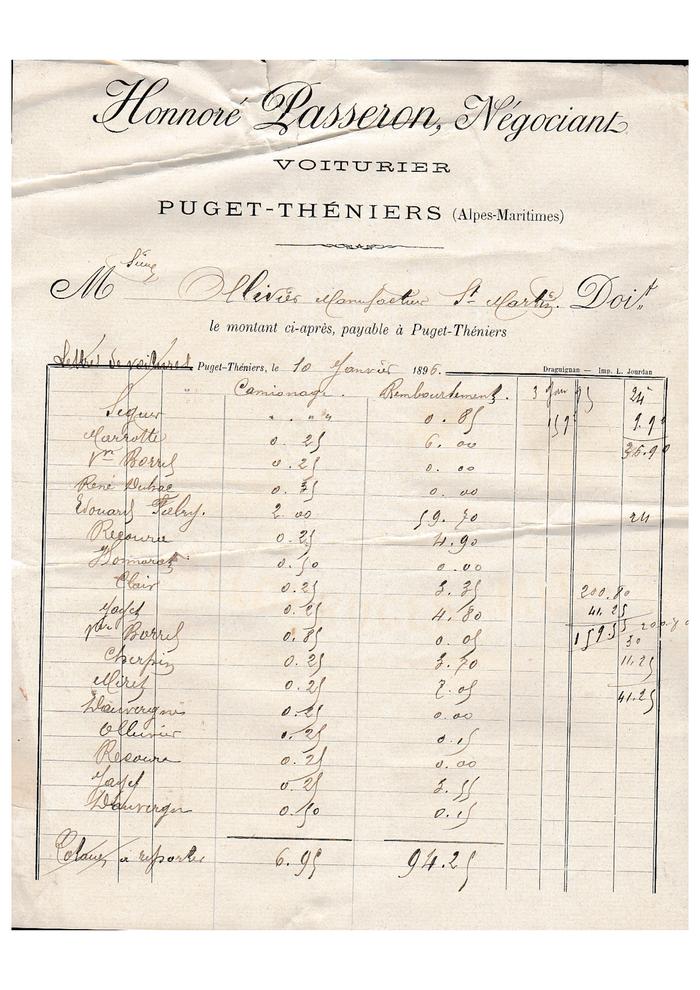 [Facture de la maison Honnoré Passeron, Négociant - Voiturier à Puget-Théniers]