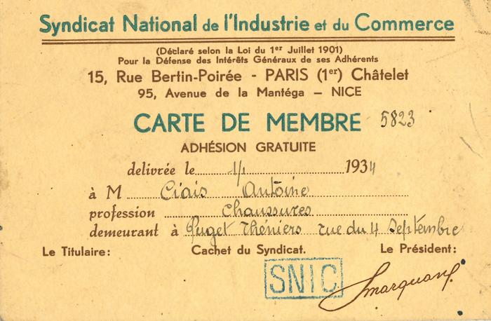 Carte de membre du Syndicat National de l'Industrie et du Commerce [adressée à Ciais, Antoine, 01/01/1934.]