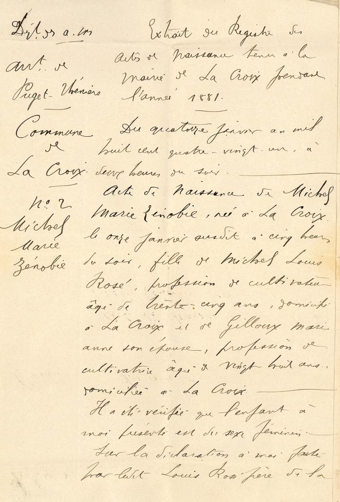 Extrait du registre des actes de naissance tenu à la Mairie de La Croix Pendant l'année 1881.[Acte de Naissance de Michel Marie Zenobie le 11 janvier 1881]