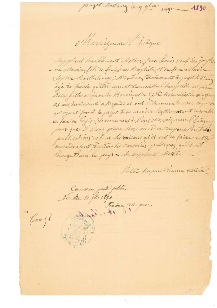 [Demande de dispense de publication de bans pour Jean-Louis Astier et Marie Rose Champossin - 1890]