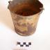 Description : Récipient sur plan circulaire (D à la base 9 cm) à bords moyens et évasés (Ht 11,7 cm D au rebord supérieur 11,3 cm) doté, en sapartie supérieure, de 2 oreilles rivetées en vis à vis . Le récipient a été doré dans sa partie extérieure