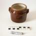 Description : Récipient sur plan circulaire, à bords moyens légèrement bombé et col à boudin. Deux anses latérales en oreilles.
