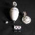 Description : Ogive de porcelaine garnie de lest (grenaille) surmontée d'une poulie. Un embase de plafond porte également une poulie déportée, pour assurer un mouflage de la lampe suspendus au fil électrique conducteur.