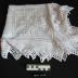 Description : Grande poche carrée formée de deux pièces de tissu assemblées sur 3 côtés, le quatrième est maintenu fermé à l'aide d'un système de trois boutons et boutonnières. La pièce de dessus a été tricotée, elle comporte quatre carrés avec des motifs ajourés, une rosace à quatre feuilles et six feuilles sur chaque côté. Ces carrés sont séparés par cinq rangées de jours. Le tour de la pièce comporte une bordure dentée. Trois boutons sont cousus dessus. La pièce de dessous est une "finette" avec un ourlet et trois boutonnières.