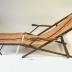 Description : Chaise longue pliante avec Monture en bois vernis - avec dossier inclinable - accpudoir - allonge appui jambe - toile à rayure.