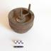 Description : Récipient sur plan circulaire à pied annulaire, bords moyens galbés et cerclés par deux cercles cloués. Le récipient est percé de trous et de d'une fente longitudinale. Au centre du récipient est fixé par avec une plaque de cuivre rouge une tige filetée. Une rondelle de bois du diamètre du récipient doublée d'une rondelle d'aluminium coulisse. Pour presser les fruits, elle est compressé par un écrou forgé avec une tige filetée courbée pour former une manivelle.