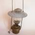 Description : Luminaire composé de : Un pied réservoir en laiton (D maxi 14,4cm, D mini 10,5 cm H 9,5 cm), pourvu d'un orifice de remplissage ( + bouchon) ; une structure de soutien, formée d'une bague enserrent le pied (D 13,5 cm) à laquelle ssont soudées deux tiges verticales (H 26,5 cm) sur l'extremité desquelles s'appuie le chapeau ; un brûleur en cuivre ajouré ( D 5,1 cm H 4,9 cm doté d'une molette latérale de réglage ; un verre ( D maxi 11 cm D mini -,8 cm , H 15 ,4 cm) contenant deux cylindres juxtaposés, le premier trapu, le 2nd plus haut et fin ; un chapeau en tronc de côbe ( D 24,8 cm H 2,3 cm), pervé au centre pour laisser le haut du verre, surmonté d'un second chapeau, plus petit ( D 10 cm H 2 cm). Le 1er chapeau est en fer émaillé, le second en fer blanc. Une anse supérieure verticale mobile ( H 18,6 cm Lg 14,7 cm) surmonte l'ensemble.