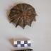 Description : motif circulaire représentant une fleur ouverte presque plate avec 12 pétales (genre de fleurs de pissenlit) qui renferme dans son calice et le motif identique mais de diamètre plus petit. Au milieu est la tête ronde d'une vis qui traverse la collerette et comporte un pas de vis a reçu une penture dégradée.