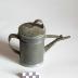 Description : Récipient sur plan circulaire à bords moyens droits avec couvercle à rebord enveloppant monté à charnière avec une anse plate fixe sommitale en forme d'oreille. Le récipient est muni d'un long bec verseur tronconique coudé, renforcé par une lame de métal. A l'opposé, une anse verticale plate fixe permet la préhension.