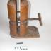 Description : Deux pièces de bois demi cylindrique à tête bombée. Elles sont mobiles et glissent sur un socle rectangulaire suivant une tige métallique parallèle à ce dernier puis coudée pour être fixée au socle. Au centre des pièces se trouve une gorge. Les deux pièces sont reliées en entre elles par des traverses et traversée par une tige filetée à tête papillon qui permet de régler l'écartement au niveau de la gorge.