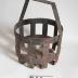 Description : Réceptacle de forme cylindrique ajouré , constitué de 10 lames de fer verticales de 3 cm de large ( Qui sont en fait 5 lames en forme de "U" très large se croisant en étoile au fond) , enserrées perpendiculairement par deux bandes de fer circulaires ( 3,3 cm de Lg). Chaque point de contact entre les bandes verticales est riveté. L'une des lames en "U" se prolonge en une anse trapézoïdale fixe qui surmonte l'ensemble.