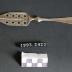 Description : Cuiller de métal à cuilleron plat en forme de palette perforée. La palette est terminée en pointe et elle est renforcée par une nervure tout le long de l'axe principal.
