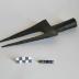 Description : Outil composé de : a: un manchon de section circulaire, ouvert aux deux extrémités ( L 9,6 cm D 3,9 cm) ; B/ Perpendiculairement à ce manchon, une barre un peu concave (L 11,2 cm Lg 4 cm, ép 1 cm) de laquelle partent, perpendiculaires, deux dents en pointes, convergentes, esquissant un plan légèrement concave come celui de (b) (L d'une dent 17,5 cm , Lg maxi 3,5, mini 0,3 cm ép 0,9 cm). Ecartement des pointes : 3,7 cm. Le manche est parallèle aux dents.