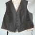 Description : Vêtement gris et noir avec doublure blanche rayée noir et blanc. Une poche intérieure. Quatre poches extérieures. Ouvert sur le devant fermeture par cinq boutons et cinq boutonnières. Dans le dos, une martingale réglable avec boucle.