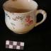 Description : Récipient individuel, sur plan circulaire, à bords hauts légèrement galbés. Il est décoré de motifs floraux bleus, rosés et dorés. Il est muni d'une anse latérale fixe.