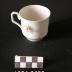 Description : Récipient individuel, en porcelaine blanche, sur plan circulaire, à bords hauts, droits. La base est d'un diamètre plus petit que celui du corps de la tasse. La tasse est munie d'une anse latérale fixe verticale. Elle est décorée avec un motif floral représentant des roses et du feuillage. L'anse est légèrement travaillée.