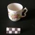 Description : Récipient individuel, en porcelaine blanche, sur plan circulaire, à bords hauts, droits. La base est d'un diamètre plus petit que celui du corps de la tasse, elle est festonnée. La tasse est munie d'une anse latérale fixe verticale. Elle est décorée avec des motifs floraux importants représentant des roses et du feuillage. L'anse est travaillée.