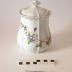 Description : Récipient en faïence blanche, à bords hauts, galbés. Il est décoré d'un motif floral. Il est muni d'un couvercle travaillé avec un bouton central de préhension. Le nom du contenu est inscrit en lettres dorées.