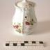Description : Récipient en faïence blanche, à bords hauts, galbés. Il est décoré d'un motif floral. Il est muni d'un couvercle travaillé avec un bouton central de préhension. Le nom du contenu est inscrit en lettres dorées.
