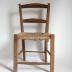 Description : Petite chaise en bois. Les deux pieds de devant sont de section carrée, ils sont verticaux ; les deux pieds arrières sont plus fins, ils sont de section carrée. Ils sont légèrement arqués et leur section va en diminuant vers l'extrémité. Le siège est en paille tressée. Le dossier est composé des deux montants extérieurs qui vont en s'écartant l'un de l'autre et de lames de bois horizontales en bas et arquées en haut; ces deux lames sont fixées entre les deux montants. Les pieds sont reliés deux par deux par un barreau horizontal. A signaler que les quatre barreaux n'ont pas la même section et sont placés à des hauteurs différentes.