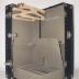 Description : Bois contreplaqué, léger et solide, recouvert de toile imitant le cuir velu. Les bandes de renforcement tout autour sont rivetées. Les angles sont renforcés par des coins métalliques rivetées. Présence d'une poignée. Deux fermetures, crampons d'arrêt, une serrure circulaire à ergot, avec deux clefs. Quatre cintres amovibles sur tringle escamotable avec presse vêtements en partie médiane. Un tiroir à bascule à trois compartiments, une sangle d'attache et un couvercle avec fermeture à pression et une poignée centrale quadrangulaire. Un tiroir amovible semblable. Intérieur doublé d'un tissu à rainure gris.