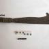 Description : Outil muni d'une lame trapézoidale avec un ergot à sa partie supérieure et d'une soie eentourée de lanières de cuir pour la prise en main et munie d'un arrêtoir métallique très fin. L du manche 11,5 cm