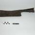 Description : Ustensile composé de : a) un manchon de forme conique mais de section elliptique ouvert aux 2 extrémités (L: 12,5 cm , D maxi : 4,8 x3,5 cm, D mini 2,8 x 1,9 cm) que prolonge b) une lame en gros rectangulaire, légèrement courbé de dos et de tranchant (L : 20,8 cm, LG : 8,5 cm, E maxi : dos 1,5 cm).