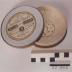 Description : Réceptacle circulaire à fond plat, bord droit muni d'un couvercle. Le fond et le couvercle sont piquetés de motifs floraux en arc de cercle ou en lancette. Couleur face principale : bleu ciel - fond : blanc - Bordure : doré