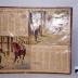 Description : Calendrier animé d'un liseré doré et de guillochis rouge. Il présente deux tableaux de scènes d'équitation humoristique en quinconce se déroulant comme une bande dessinée et intitulé : "l'éclabousseur" à l'opposé se trouvent les mois encadrés par un liseré rouge. L'intitulé se trouve en haut à gauche en noir sur fond blanc.