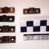 Description : Cinq plaques rectangulaires de laiton percées aux deux extrémités afin de les visser. Elles comportent les lettres "A", "B", "C", "D", "E" en relief. Certaines entourées d'un cercle, d'autres d'un carré.