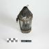 Description : Verre absent. Le verre était serti aux sommets et à la base par des anneaux plats circulaires. Celui de la base fait office de socle. Les deux anneaux sont reliés par une bande métallique perpendiculaire au plan du cercle. L'anneau supérieur est muni d'une charnière à gond afin de refermer le toit/couvercle sue le verre. Le toit est un cône tronqué se fermant par une patte à encoche qui se crante sur l'ergot de l'anneau supérieur. le toit est entaillé d'encoche en forme d'écaille. Au sommet est fixé un fil de fer en "V" recourbé aux deux extrémités. Une coupelle à quatre pans surbaissés est fixée sur un second fil de fer se terminant par une anneau afin de permettre la suspension de la lanterne. A l'intérieur se trouve un porte mèche sur plan carré aux angles chanfreinés. Un fût cylindrique permet de passer la mèche. Une patte se terminant en volute permet de fixer le porte mèche sur le rebord.